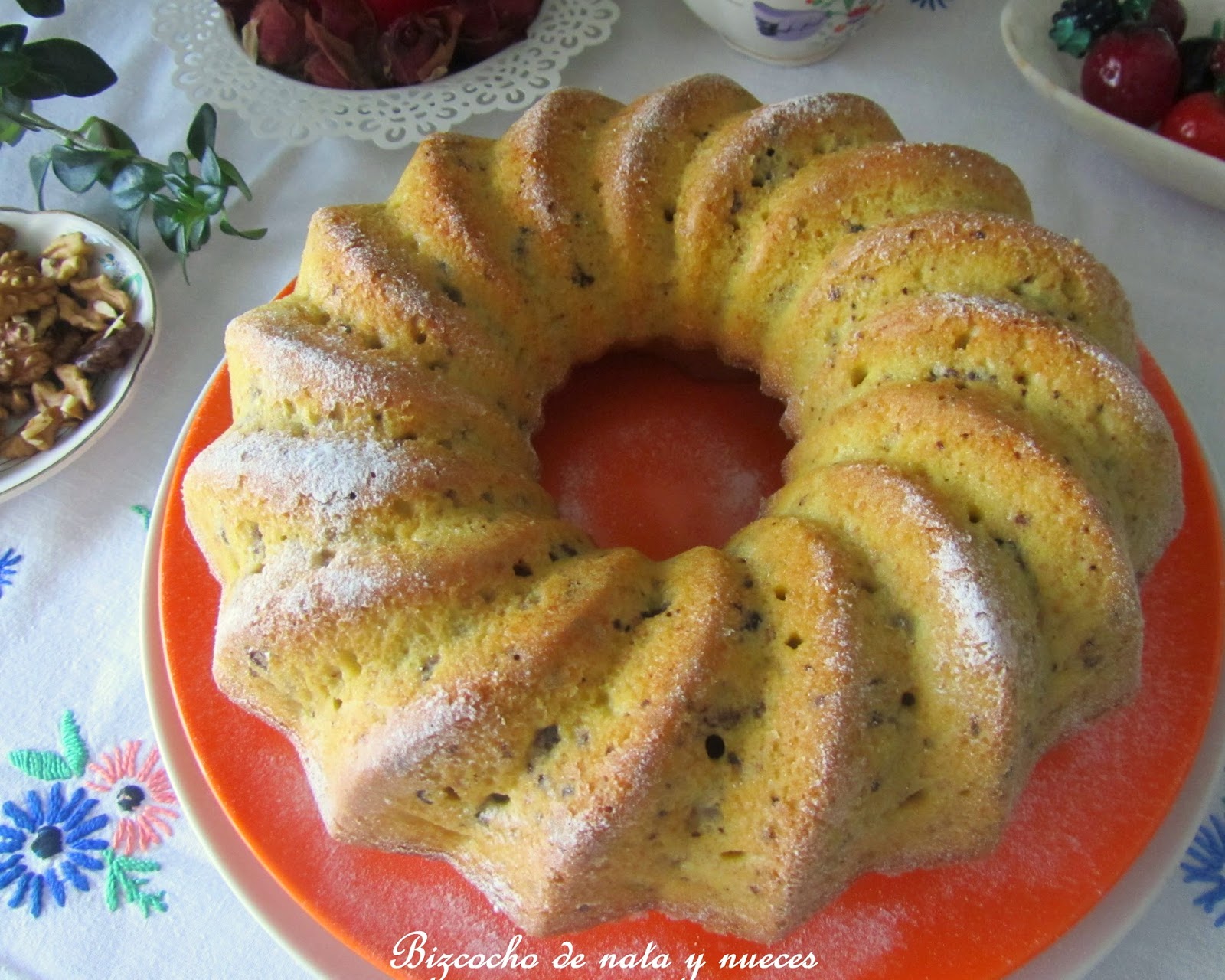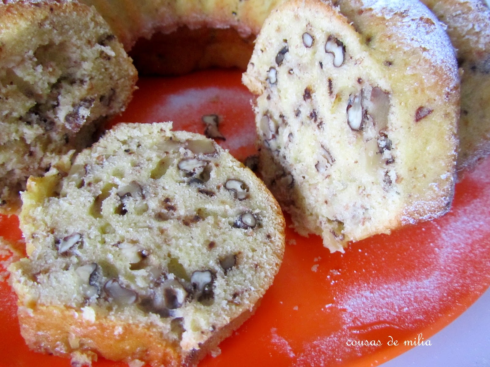 Este es un bizcocho delicioso para compartir con los amigos alrededor de unas tazas de café, o de té, en una distendida charla... Y también para compartir con otros muchos amigos... vosotr@s que me leéis, con los que no es posible sentarse físicamente a compartir ese café, pero si que lo hago muchas veces virtualmente. Este bizcocho va por tod@s, ¡por los de aquí y por los de allá! Y de paso aprovecho para daros las gracias por vuestro interés por la evolución de mis males. Os diré que estoy mejor, no bien del todo, pero supongo que poco a poco, está claro ¡que esto es más lento que el caballo del malo! Esta maravilla de bizcocho lo publicó hace algún tiempo mi amiga Viví Taboada... me encantó, y pasó a engrosar mi lista de pendientes esperando el momento adecuado... este llego hace un par de meses, cuando otra buena amiga de las dos, Vero, lo publico; con la coincidencia que esa misma semana había estado visitando a María José, que es amiga de las tres, y me había regalado una bolsa de nueces de su pueblo... ¡mejor imposible! La receta es la misma, solo que en casa somos menos dulceros y le puse la mitad del azúcar, y harina integral, lo demás es igual a la de mis amigas... ¡está buenísimo!