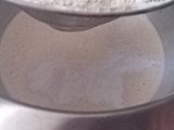 4. - Ahora añadiremos la mitad de la harina tamizada junto con la levadura y seguimos mezclando con cuidado.
