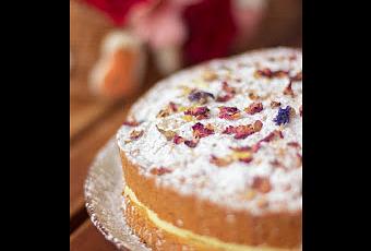 Partimos el bizcocho por la mitad con la ayuda de un cuchillo largo, mejor si es de sierra. Retiramos la tapa superior con cuidado y rellenamos con abundante cantidad de crema. Volvemos a cubrir el bizcocho y decoraremos con azúcar glas. Yo además lo he cubierto con unas preciosas flores comestibles.