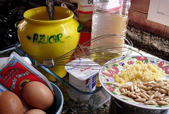 - Yogur 1.- Harina de repostería, 3 vasos.- Azúcar 2 vasos.- Aceite de girasol (o de oliva) 1 vaso.(Tomamos como medida para los tres el vaso del yogur)- Huevos 4. - Levadura Royal, 1 sobre.- Ralladura de limón.- Piñones.- Azúcar para espolvorear.