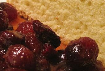 En un cazo colocamos los arándanos y cubrimos con zumo de melocotón, dejamos cocer hasta que reduzca. Si no os gusta el sabor ácido de los arándanos sustituirlo por uvas pasas.