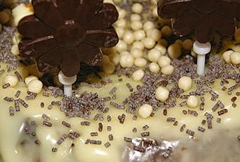 - bolitas de chocolate blanco, fideos de chocolate y piruletas de 2 chocolates.