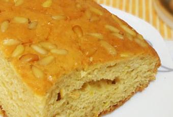 2. Untamos un molde con mantequilla, espolvoreamos con un poco de harina y añadimos la masa del bizcocho. Esparcimos los piñones por encima.