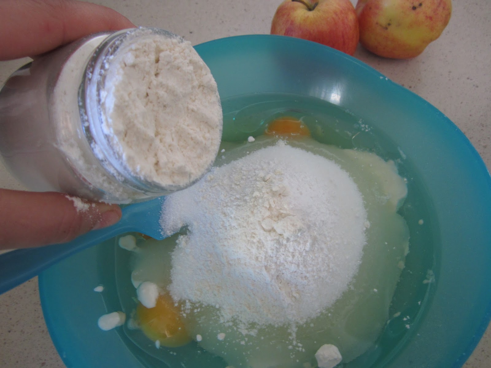 Una medida de aceite de girasol, 2 medidas de azúcar, 3 medidas de harina un sobre de levadura, cuatro huevos y la ralladura de un limón. Y el yogur que habíamos reservado.