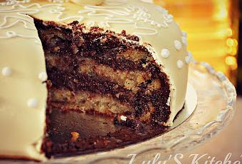 Para el relleno usé un frosting de chocolate que saqué de uno de los libros de Peggy Porschen. Un frosting de chocolate muy fuerte de sabor. Aconsejo, si queréis disfrutar del delicioso sabor del bizcocho al Grand Marnier, usar otro tipo de relleno más suave, aunque el libro de donde saqué esta genial receta aconseja espolvorearlo con azúcar glas o un glaseado de chocolate. Aun así, ¡estaba genial!