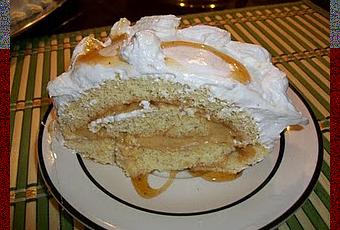Para asamblar el bizcocho: - Desenrollamos el bizcocho, untamos con un almíbar( pinche la palabra almíbar, para la receta) y la crema pastelera de praliné.