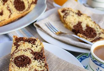 Agregue a la batidora las tres yemas y el azúcar y deje mezclar hasta aclarar. luego agregue la mantequilla derretida y siga batiendo hasta unir. Añade poco a poco y tamizado la harina y la levadura en polvo y mezcle hasta unir. En otro bol, monta las claras a punto de nieve y agregue a la mezcla anterior con una espátula suavemente. Separe una parte de la mezcla y añade el chocolate derretido en el microondas. Mezcle hasta oscurecer. Prepare un molde con mantequilla y harina para que no se pegue la mezcla. En este paso agregue sutilmente al molde ambas mezclas con dibujos de hilos, un poco de la mezcla clara y otra con el chocolate. Lleve al horno treinta minutos a 180 grados o hasta pinchar en el centro con un palillo salga limpio. Deje enfriar y retire del molde. Sirva en lonchas, de esta manera se apreciará el dibujo.