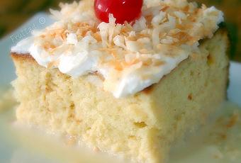 ProcedimientoMezcla bien las leches y viértela sobre el bizcocho aún caliente, deja enfriar y guárdalo en nevera por media hora, mientras preparas el frosting o si prefieres usa crema batida, decora con coco rallado y una cereza.