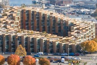 La punta sudoeste del edificio se extiende hasta Gärdet; y para crear un borde humano entre el edificio y la naturaleza, se empuja hacia abajo hasta el perfil más bajo, transformándolo en una plataforma pública con una vista de 270 grados del paisaje del parque y liberando simultáneamente la mayoría de las unidades residenciales a las vistas del parque. El mismo movimiento también asegura que el patio central siempre recibirá cantidades copiosas de luz solar. En mayor deferencia a Gärdet, la masa se reduce visualmente a través de un lenguaje de píxeles, escalado a la forma humana.