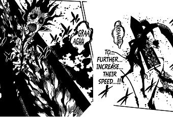 Justo cuando se burlaba de ellos, Yuno usa su magia de viento para aumentar su velocidad. Entonces Asta aparece en un instante y apuñala al Diablo con su espada. Esta vez, el diablo está gravemente herido. Hace que el diablo se vuelva loco. Empieza a hablar mal de todos y sigue diciendo que puede matarlos a todos en un instante. Ha terminado de jugar y está listo para terminar esto ahora. Asta está confundido cuando trató de perforar su corazón, pero parece que su corazón está en otra parte. Entonces, de repente, un montón de bocas llegan al cuerpo del Diablo cantando algo en el lenguaje del Diablo.