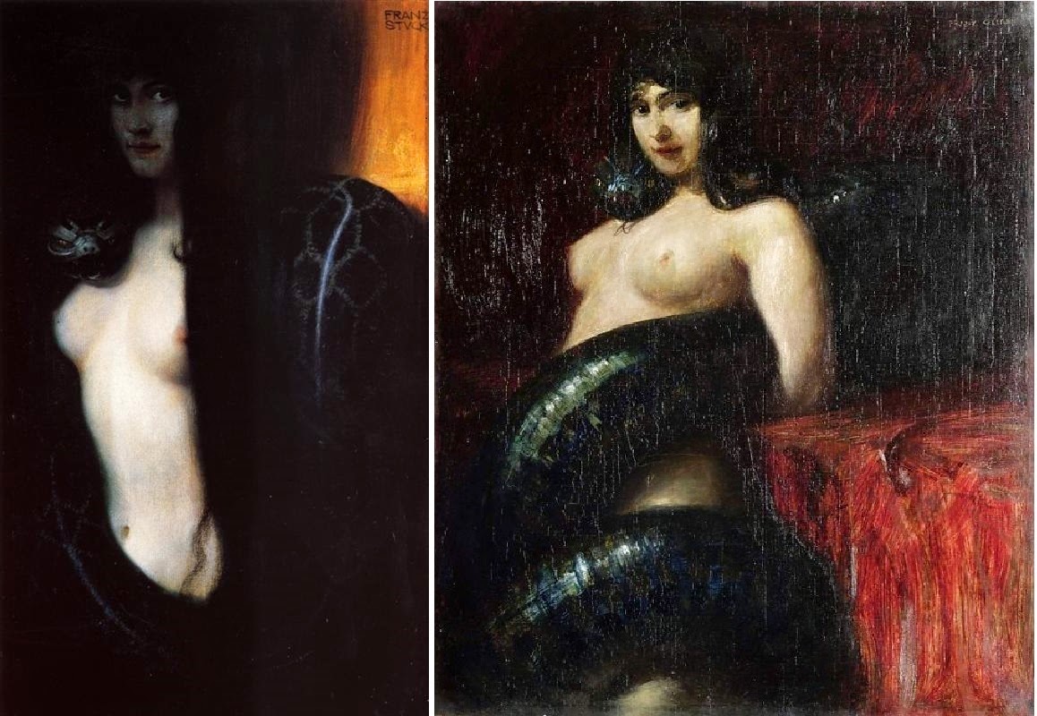 Von Stuck, pintor alemán modernista, a la izda. Pecado I 1893, a la dcha. Sensualidad III 1891Fui a ver Blade runner con mi novia ya que ella no la había visto nunca en pantalla grande y es una de sus pelis favoritas así que inevitablemente salió el tema de los personajes femeninos. En este visionado caí en que la peli es un tanto machista. No es criticable porque es producto de su época, pero no está de más denunciarlo. Todas las mujeres se presentan como objetos eróticos masculinos: una es una bailarina exótica, otra es una esclava de placer (menos que prostituta porque estas cobran y algún poder de decisión tienen) y la última es el interés romántico del protagonista. Así mismo hay una clara división machista entre ellas: la doncella es buena y las expertas son malas. El interés romántico es virgen y por ello puro-bueno de modo que esta favor del "héroe", el campeón del patriarcalismo, y es un objeto pasivo, la princesa a rescatar, e inofensivo, es la única que no pelea contra el "héroe". Las otras, ya desvirgadas y por tanto sabiendo lo que vale un peine en el patriarcado, son activas, son rebeldes, y peligrosas, ambas están a punto de matar al "héroe". Así, no sorprende que una peli futurista use un símbolo que para la fecha del relato ficticio tiene más de 100 años. El título del espectáculo de la bailarina, "Salomé y la serpiente", nos retrotrae a la época victoriana, cuando el comienzo de la liberación de la mujer aterrorizó tanto a los hombres que crearon la femme fatal, aquella mujer que conjuga en sí misma los opuestos Eros y Tanatos. Son mujeres sexuales, es decir, vitales, y a la vez mortales. Salomé usó su sexualidad para matar al primo del hijo del dios de los cristianos y por ello se convirtió a finales del XIX en advertencia de lo peligrosas que son las mujeres liberadas de las sabias y prudentes cadenas patriarcales. No hace falta hablar de la serpiente y el cristianismo. El último elemento machista del film es la escena de la 1ª vez de Deckard y su nexus 6. Es violenta, que no es lo mismo que sádica. Al final, para follar Deckard se tiene que poner violento de modo que queda a la vista la incapacidad del machista para poner a tono a la mujer así como la inhibición sexual de la mujer patriarcal ya que obligada a ser casta sólo puede ir al sexo forzada. En la escena ni hay seducción ni deseo sexual femenino y eso hoy queda chungo por muy replicante que sea y muy angustiada que esté la damisela. De todos modos la liberación femenina se cuela en la peli. Virginia Woolf escribió que si un personaje femenino se define sólo por su relación con los hombres entonces su origen es machista. Así, siguiendo esta definición sabia y preclara, tanto la esclava como la damisela lo son. Una es pareja del antagonista y la otra del protagonista. Pero la bailarina es independiente. Por ello es mayor que las otras y más masculina, está entrenada para ser una asesina. Sin embargo sigue inmersa en el patriarcado de modo que ha de satisfacer al hombre. Así, sin ninguna razón, el personaje es una bailarina exótica (eufemismo para erótica). De las 3 actrices es la única que enseña los pechos y es la que más erótica (eufemismo para más desnuda; el rollo de las lentejuelas y la desnudez de Salomé es invento del Simbolismo) va. Entre eso y que Deckard la mata de varios disparos por la espalda mientras huye deja mal la peli porque parece que se ensaña con la única mujer moderna que sale en ella. Por otra parte los personajes femeninos sometidos al hombre tienen sus rebeldía. La esclava se rebela contra su condición de descanso del guerrero volviéndose activa y letal y, sobre todo, libre. La damisela se rebela, pero menos pues sigue siendo el objeto a rescatar, liberándose de todo artificio. Comienza la peli con vestidos caros y peinados de peluquería que delatan su condición artificial, no es un individuo, es una muñeca (cosa que recuerda a la nexus esclava pues su aspecto, aunque moderno, tiene algo de juguete), pero cuando Deckard la libera (follándosela; tradicional forma patriarcal de tomar posesión de una mujer; la esposa-siervo es para quien la desvirgue) su look se torna natural: se libera de la moda patriarcal por lo que va con el pelo suelto y largo (un gran desafío al patriarcalismo como se puede ver hoy en día en el tema del hiyab, el velo, el burka y variantes) y deja de lado la moda que deforman su figura para que sea más deseable para el varón (unas grandes hombreras que acentúan la estrechez de la cintura) para exhibir su cuerpo tal y como es.