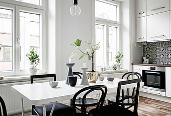 La moderna cocina de líneas rectas y tiradores lisos, contrasta con el revestimiento de la pared sobre la encimera de baldosas marroquíes formando cenefas que nos recuerdan a los tallados de la Alhambra en estricto blanco y negro y también la moldura ornamentada del techo. Elementos de estilos muy diferentes, pero que juntos funcionan a la perfección.