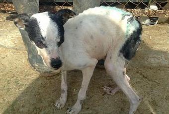 Esta es Blanki,una bodeguera de dos años que no ha tenido suerte en la vida,como muchos perros fue adoptada por una familia que luego al crecer y molestar mas de la cuenta dejo en un campo a un señor que tiene muchos perros y muchos gatos, todos estan gorditos y sanos, los recoje de la calle, menos ella, creo que tiene leishmania por sus síntomas, ha pasado ella sola la sarna, se quedo media calva segun lo que me cuenta su dueño, la trato con pomada que por lo que veis le ha mejorado mucho ya que vuelve a tener pelo en el lomo, pero en sus patitas no, aun las tiene como en carne viva. ((en las fotos podeis verlas, y tambien sus uñas, me deja que le lleve a que la vea un veterinario despues de mucho rogarle ya que el no puede pagarle la consulta ni la medicación, esta en paro y vive de lo que trabaja en el campo, la perrita no puede ni sostenerse en pie, me entro ganas hasta de llorar cuando la vi, tiene ulceras en la piel causadas por su delgadez, los huesos del culo es lo primero que toca el suelo no su carne y los tiene fuera, aun asi ella te saluda moviendo su rabito cortado.