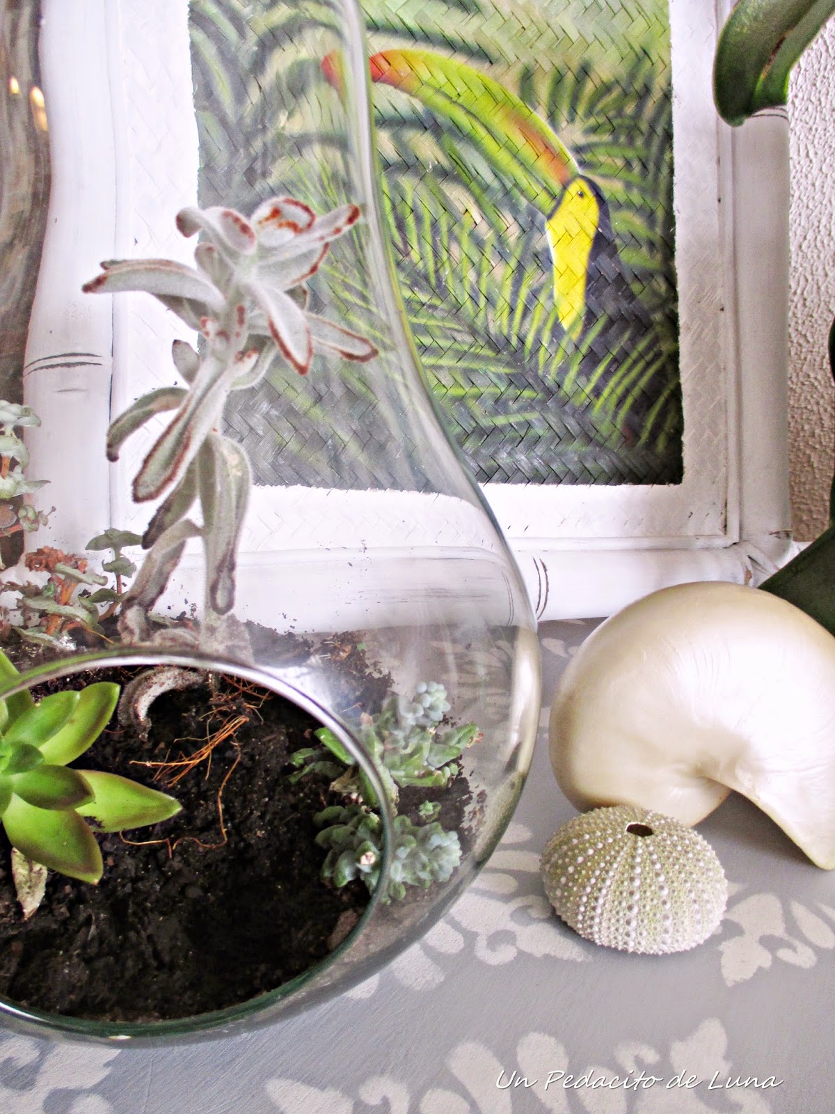 Esta pera de cristal, también encontrada en un rastro con mil adornos navideños dentro,la decoré con unas mini suculentas que han encontrado su hábitat perfecto, faltaría añadirle algunas piedrecitaspara que luzca aún mejor...Hay vida dentro, es alucinante ver cómo crecen las plantitas adaptándose al medio !!