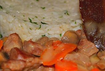 Para la guarnición, ponemos a calentar un poco de aceite, añadimos un vaso y medio de arroz, rehogamos y añadimos 3 vasos de agua. Condimentamos con sal y cocemos 13 minutos, colamos y condimentamos con perejil picado.