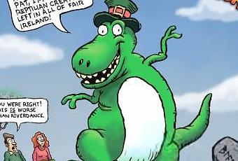 Quien nos conozca un poco sabrá que por aquí no somos muy de santorales, pero hoy vamos a aprovechar esta viñeta del ilustrador norteamericano Jon R. Herman para felicitar el Día de San Patricio, patrón de Irlanda, a todos nuestros visitantes. El dinosaurio Blarney se refiere con su comentario a la tradición irlandesa que atribuye a San Patricio la hazaña de haber librado a la isla de la presencia de reptiles (más concretamente de serpientes). En la actualidad, Irlanda es la única región de las islas británicas que no posee ofidios silvestres, debido a su separación de Gran Bretaña poco después de finalizar la última glaciación.