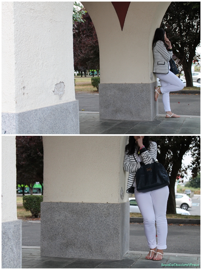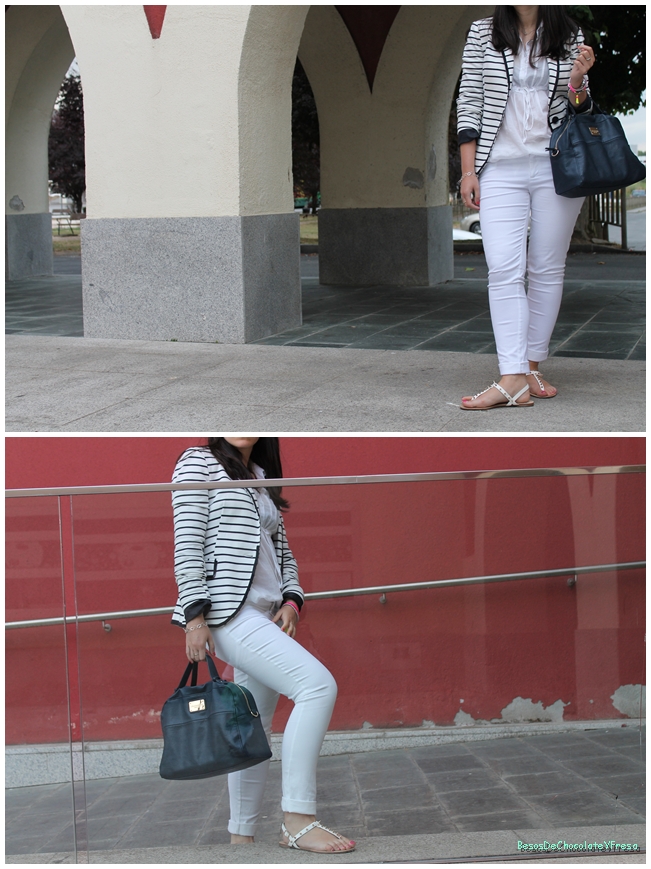 Lo combiné con pantalones y camisa blanca, sandalias de pinchos y bolso azul marino a juego con las rayas que ya conoceis y que se han convertido en un básico imprescindible para este verano.