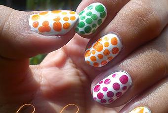 Primero se da una capa de color base, en este caso el color blanco. se deja secar y se aplica una segunda capa esta debe de ser un poco más gruesa. Inmediatamente de haber puesto la segunda capa de base, se toma el esmalte del color que queramos hacer las gotas y ya sea con el mismo pincel del esmalte o con ayuda de un puntero el cual con ese fue con que yo lo hice para que no salieran tan grandes las gotas, dejamos caer el esmalte. Este se extenderá así que hay que cuidar poner las gotas muy juntas para que no se junten.