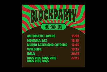 Este año el Blockparty Arganzuela se realizará el 19/10, una jornada sola pero con muchos directos desde las 15:00 (como podemos ver en los horarios). Este año en la Explanada Negra Multiusos de Madrid Río contará con un cartel formado por Automatic Lovers, Mohama Saz, Nuevo Catecismo Católico, Wyldlife, Bala y por Pigs Pigs Pigs Pigs Pigs Pigs Pigs. Se suman Albert Petiti y Cosmetic Couple a los platos.