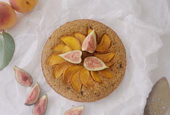 - Engrasamos un molde redondo de 18 cm de diámetro o cuadrado pequeño, y añadimos la mezcla. Ponemos encima el melocotón lavado y cortado en láminas.