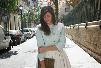 ¿Como conseguirla? Equilibrando la anchura de los hombros con la de las caderas. Nosotras lo hemos conseguido con una chaqueta con hombreras y una falda de vuelo con volumen.No podemos olvidar la importancia de los complementos, los zapatos a juego de la chaqueta, y el contrastado bolso, le dan un toque diferente al resto del look.