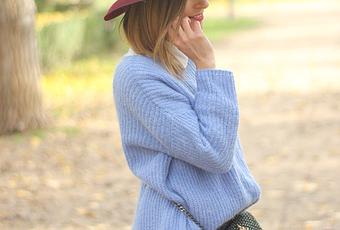 Happy Monday !! Today I show an outfit in blue tones. Yesterday I opted for a dark blue skirt which I combined with a light blue sweater. I gave it a touch of color with accessories, with a burgundy hat and a bag with dots.