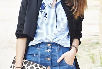 Muy buenos días chic@s!!! Otra de las tendencias de esta temporada son las camisas con bordados, podemos encontrar en todos los colores y hoy os propongo un look con una de ellas. Las que me conocéis sabéis mi preferencia por las rayas en azul de ahí que, aunque en el armario tengo varias opciones muy parecidas, no me he podido resistir, además creo que es una de las opciones más versátiles y que más opciones a la hora de combinar nos permite. Esta blusa de Romwe (aquí), me encantó nada más verla y con el bordado ya me convenció absolutamente. Aprovechando este tiempo que nos permite aún ir sin medias la he combinado con una falda denim abotonada y un trench en negro muy ligero. Como calzado botines, y como complementos los calcetines, otra de las tendencias de este invierno, un clutch en animal print y cómo no un choker. Espero que os guste!! FELIZ MIÉRCOLES!!