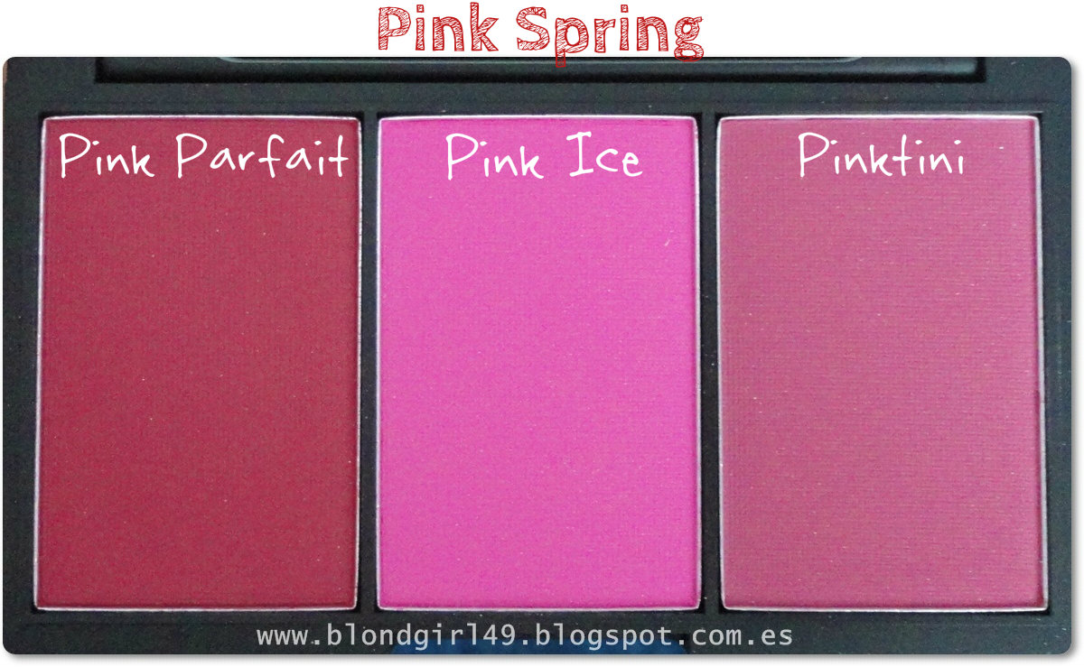 El de la foto de arriba es el "Pink Parfait" que tiene un tono frambuesa-granate monísimo, tengo que decir que pigmenta una barbaridad pero hay que cogerle el truquillo al usarlo para no pasarnos, con una brocha que no recoja demasiado color va genial (yo uso una de Bareminerals que viene genial^^).Este tono lo usé en el look de maquillaje en tonos verdes que os enseñé hace no demasiado (aquí podéis verlo) todavía estaba aprendiendo a modular el color jaja lo veréis algo subidito de tono según como le da la luz.