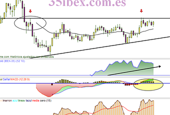 El gráfico mensual de BME, es bastante claro: la tendencia de fondo en la empresa es lateral, con tintes alcistas. Sólo la superación de la resistencia de la zona de 21 euros, abriría la puerta a mayores subidas para la cotizada. En líneas generales podemos considerar que el “momentum” es alcista, ya que tenemos al MACD por encima de su línea cero y además la fuerza relativa nos dice que está más fuerte que el IBEX 35.