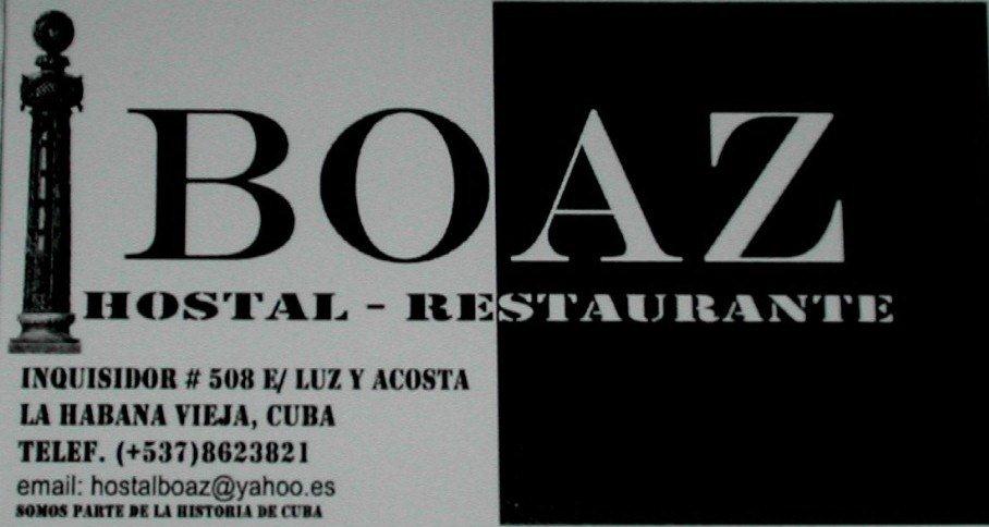 Situado en el corazón de la Habana Vieja (Old Havana), está en el centro turístico y peatonal de la capital cubana. Está a sólo dos calles de distancia del Hotel Santander y a pocos pasos de El Capitolio, inspirado en el edificio del Capitolio de EE.UU. y ahora es el hogar de la Academia de Ciencias de Cuba. A pocos minutos tanto del El Museo del Ron, y El Museo del Chocolate, y sirve como un lugar referente para almorzar y explorar intereses culinarios y visitar los otros sitios de la ciudad, o para un encuentro agradable tanto para grupos, parejas o familia, y está disponible para eventos privados, así como cenas informales.Este esfuerzo es un ejemplo del nuevo movimiento en cuanto al crecimiento económico y la propiedad personal que está ocurriendo hoy en Cuba bajo el gobierno de nuestro vecino del sur.La cocina de primer nivel en calidad se basa en las tradiciones cubanas, y tanto el personal y los propietarios tienen décadas de experiencia en la hostelería, restaurante y hotel de negocios a través de toda la isla.El menú varía regularmente desde platos tradicionales cubanos como la “Ropa Vieja”, a la langosta y varios platos de carne de cerdo, uno de los favoritos en la cocina cubana. La cocina cubana es una mezcla embriagadora de las latitudes Ibérica, las Islas Canarias, y las influencias africanas traídas por los muchos inmigrantes que llegaron a la isla a lo largo de los siglos.Los precios son razonables y están en el promedio tanto de 20 dólares EE.UU.. Boaz tiene un bar bien surtido, incluye lo mejor de ron cubano y bebidas varias. Para los que tienen otros gustos, Single whiskys de malta, cervezas nacionales e importadas y bebidas no alcohólicas están también disponibles.