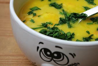 Colar el caldo, añadir la yuca cocida y triturar con la batidora hasta obtener una crema. Añadir la cúrcuma, mezclar bien y poner al fuego de nuevo al mínimo. Añadir el tomate pelado y en trocitos, la pasta hecha en el mortero y la leche de coco y remover bien, dejando cocinar a fuego mínimo para que no hierva. Rectificar de sal si es necesario.