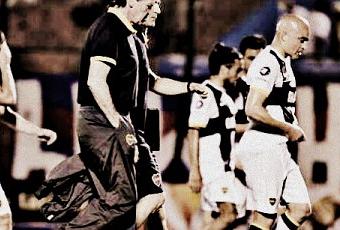 Falcioni y los titulares, cabizbajos al fin del primer tiempo en Paraguay