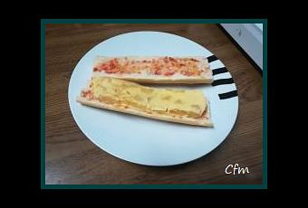 -Cortamos un poco los extremos del pan y lo abrimos por la mitad-Lo untamos bien con el tomate-Le echamos un chorrito de aceite-Colocamosun trozo de tortilla encima