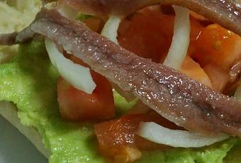 Abrimos las chapatas y untamos la parte de abajo con el aguacate. Añadimos los daditos de tomate y la cebolla (cortada como en la foto). Repartimos las anchoas (bien escurridas) y servimos inmediatamente.