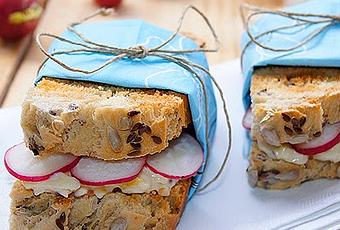 - 6 rebanadas de pan de semillas.- 3 cucharadas de mayonesa.- 1 cucharadita de mostaza a la antigua.- 40 grms de queso cheddar.- 1/2 manzana golden.- 4 rabanitos.