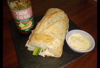 Abrís vuestro bocata de chapata y le untáis por ambos lados una capa generosa de mayonesa de chimichurri, luego colocáis el tomate, la cebolla, el aguacate, los tranchetes de queso cheddar y el fiambre de pavo y os lo lleváis a la plancha para darle varias vueltas y calentarlo un poco. Lo sacáis y ya lo tenéis listo para comer.