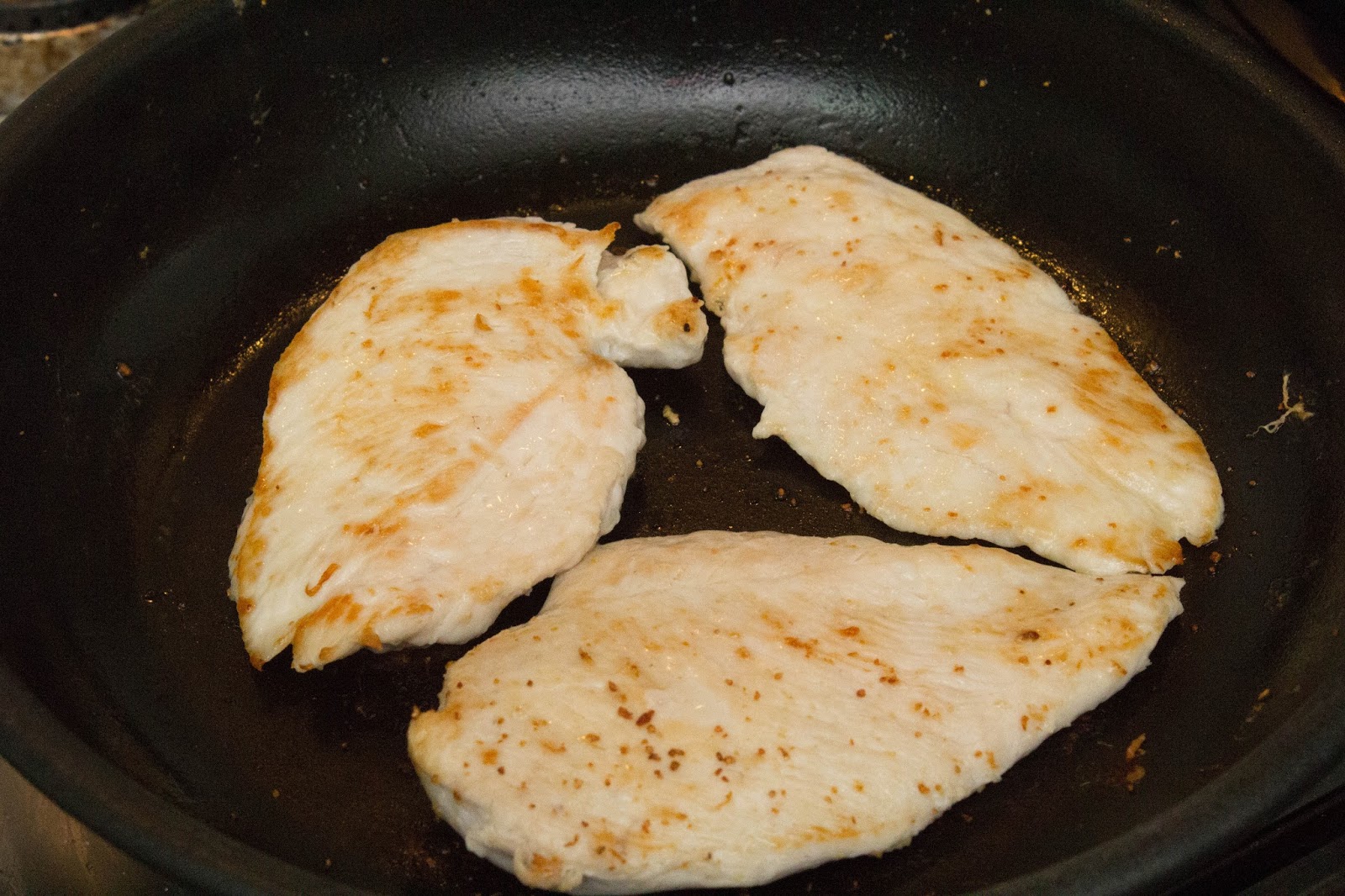 En una sartén poner una cucharadita de aceite y sofreír el pollo por los dos lados, a mi me gusta crujientita.