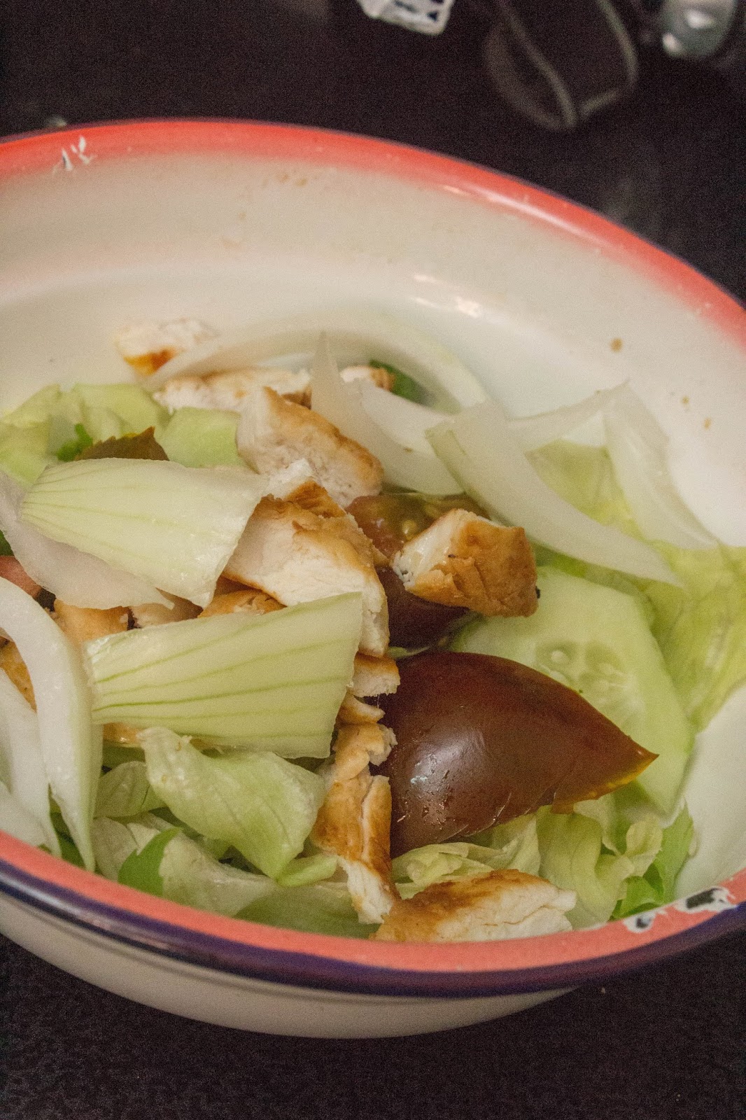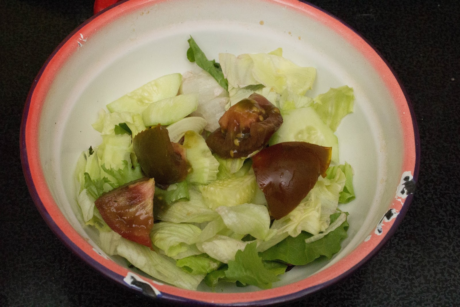 Poner en un bol la mitad de la lechuga y del tomate y el medio pepino, aliñarla con una cucharadita de aceite, sal y vinagre.