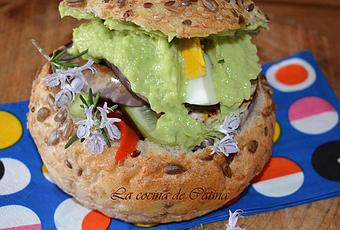 Quitar la mitad de la miga de la parte inferior del pan. Frotar con el ajo las paredes y después añadir aceite de oliva. Rellenarlos con las rodajas de tomate, cebolla, láminas de pimiento, las tiras de pepino y las rodajas de berenjena. Repartir el resto de quacamole, los huevos duros en cuartos y las flores de romero sobre el relleno. Cubrir con el casco y presionar ligeramente.