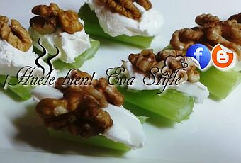PREPARACIÓN 1.- Limpiamos las ramas de apio, las lavamos y cortamos en 3 trozos de cm de largo. 2.- Mezclamos el queso con la sal y la pimienta.3.- Untamos el queso sobre el apio y decoramos con una nuez.