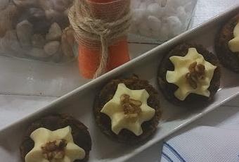 Cortamos porciones con un cortador pequeño y ponemos un poco de frosting de queso encima y para decorar una nuez.