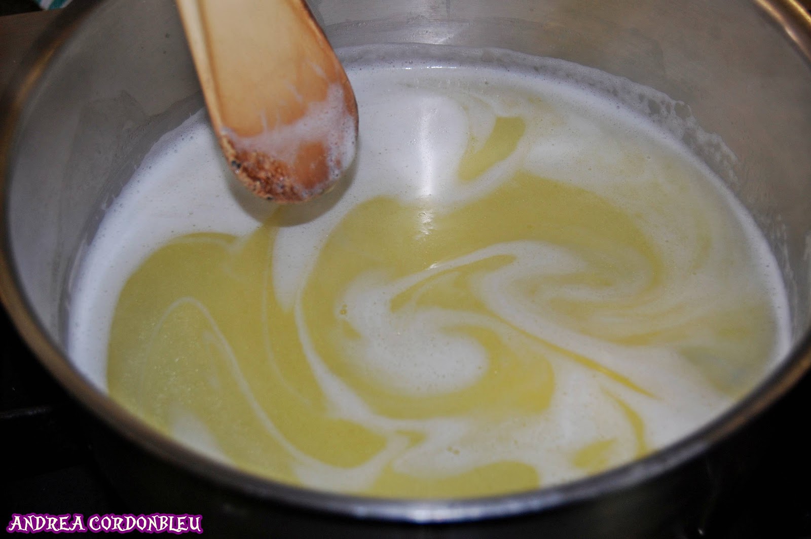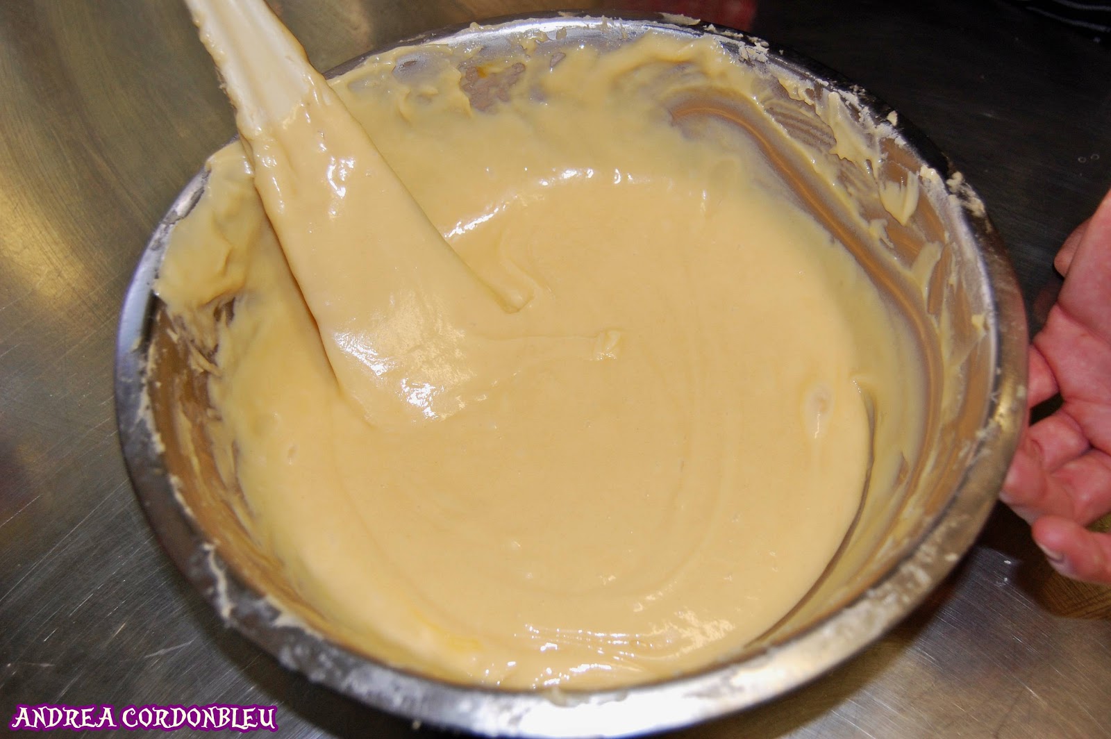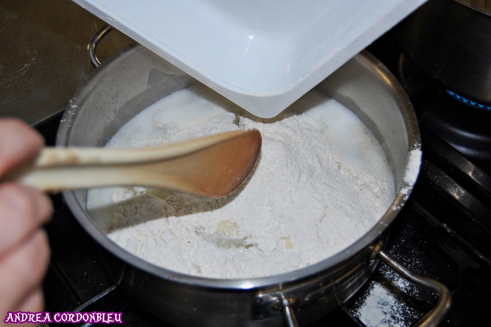 Se añade la harina de golpe y se trabaja enérgicamente en el fuego hasta matar el sabor a harina cruda, moviendo con una paleta. Se tiene que despegar del recipiente y formar una pasta compacta y unida (escaldado).
