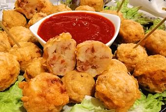 Servir los bocaditos de patata acompañados de la salsa de piquillos y miel.