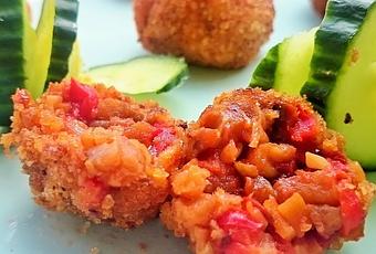 4. Cogemos pequeñas porciones de pisto y formamos bolitas con las manos.