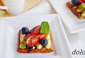 Montar el bocado: encima de un cuadrado de hojaldre poner crema pastelera, encima un par de trozos de fresa, dos arándanos y una hojita de menta. Antes de llevar a la mesa poner un poco de sirope de chocolate.