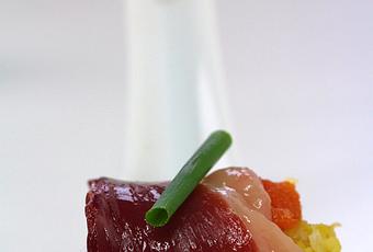 - For the appetizer, put a cub of polenta, a pinch of tomato sauce, a piece of dry tomato all enveloped on a duck ham slice. Garnish with a sprig of chives.