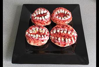 - Comienza a formar los dientes con el fondant blanco. Haz bolitas pequeñas del tamaño de un grano de maíz, haciendo la raíz del diente para que sea más fácil introducirlo en las encías.- Fíjalos pasando un pincel con un poco de agua en la unión de los dientes con las encías.