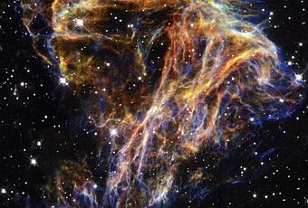 Parecen las bocanadas de humo y las chispas de un espectáculo de fuegos artificiales de verano en esta imagen del telescopio espacial Hubble, estos filamentos delicados son en realidad hojas de escombros de una explosión estelar en una galaxia vecina. El objetivo del Hubble era un remanente de supernova dentro de la Gran Nube de Magallanes (LMC), una cercana y pequeña galaxia compañera de la Vía Láctea visible desde el hemisferio sur. Llamado N 49, o DEM L 190, este remanente es de una estrella masiva que murió en una explosión supernova cuya luz habría alcanzado la Tierra miles de años atrás. Este material filamentoso será reciclado en la construcción de las nuevas generaciones de estrellas en la Gran Nube de Magallanes. Nuestro propio Sol y los planetas se construyen a partir de los desechos similares de supernovas que explosionaron en la Vía Láctea miles de millones de años atrás.