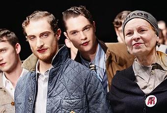 El toque atrevido como de constumbre lo puso la extravagante diseñadora británica Vivienne Westwood, ella sabe que el rouge esta de moda, asi que ni corta ni perezosa dedició dar la nota de color a las lánguidas teces de sus modelos maquillando de este atrevido tono los labios de sus maniquís, aunque esta vez no les hizo vestir con falda, sino que apostó por trajes modernos con cierto aire retro,combinado con peinados engominados con ondas al frente al más puro estilo dandy, mezcla cuanto menos curiosa, la delicadeza de los "morritos carmesí" de los chicos que lucían sus diseños no iban a juego con la actitud provocadora y desafiante de algunos de ellos.