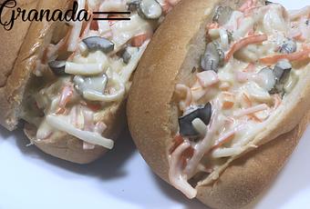 Bocata de surimi, aceituna negra, pepinillos, mayonesa...